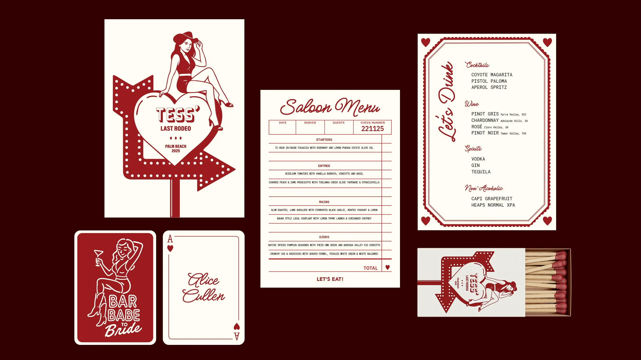 “Tess’s Last Rodeo” is where Coyote Ugly grit meets hens party glamour. Deep cherry red and cream tones set the scene for a sultry sunset celebration — think bar-top energy, leopard prints and neon lights against chrome accents. The design balances 90s nostalgia with a chic modern twist, steering clear of cliché western tropes while keeping the spirit of the film alive.